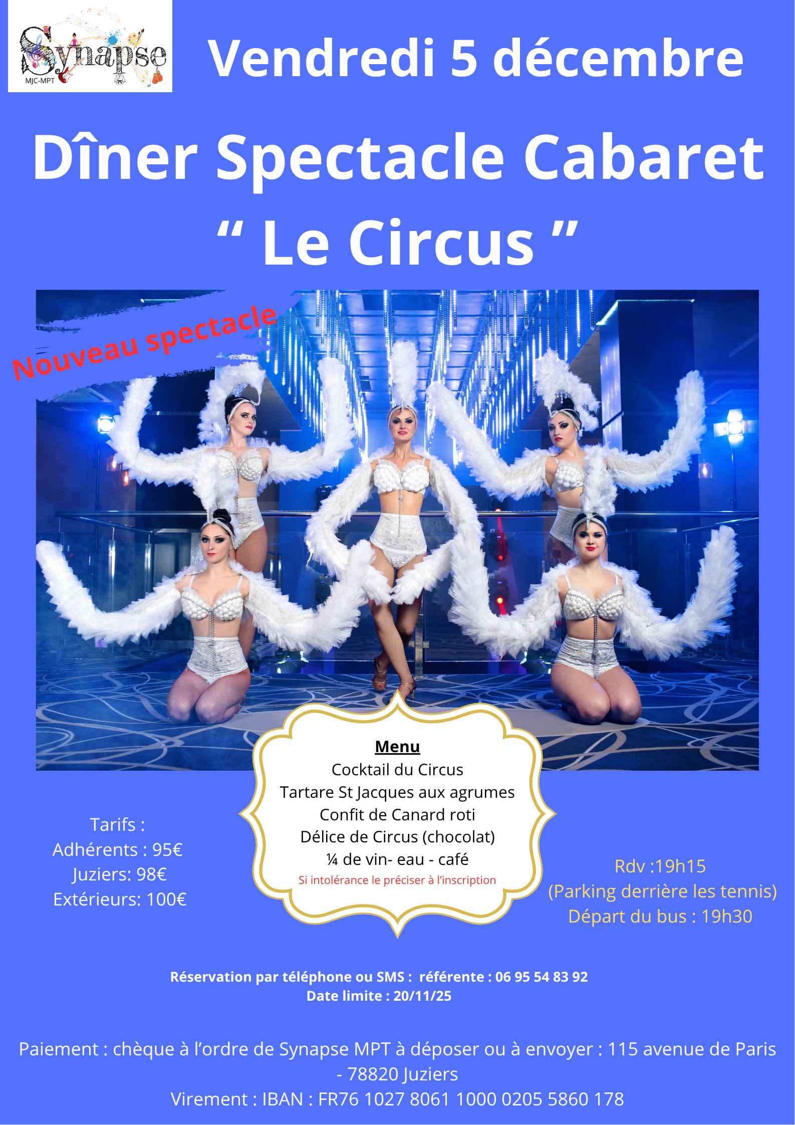 Accueil > Agenda > Diner spectacle cabaret le Circus Diner spectacle cabaret le Circus vendredi 5 décembre - 23:59 Visuel Affiche Infos & réservations Parking terrains de Tennis rue Janine Vins 78820 JUZIERS
