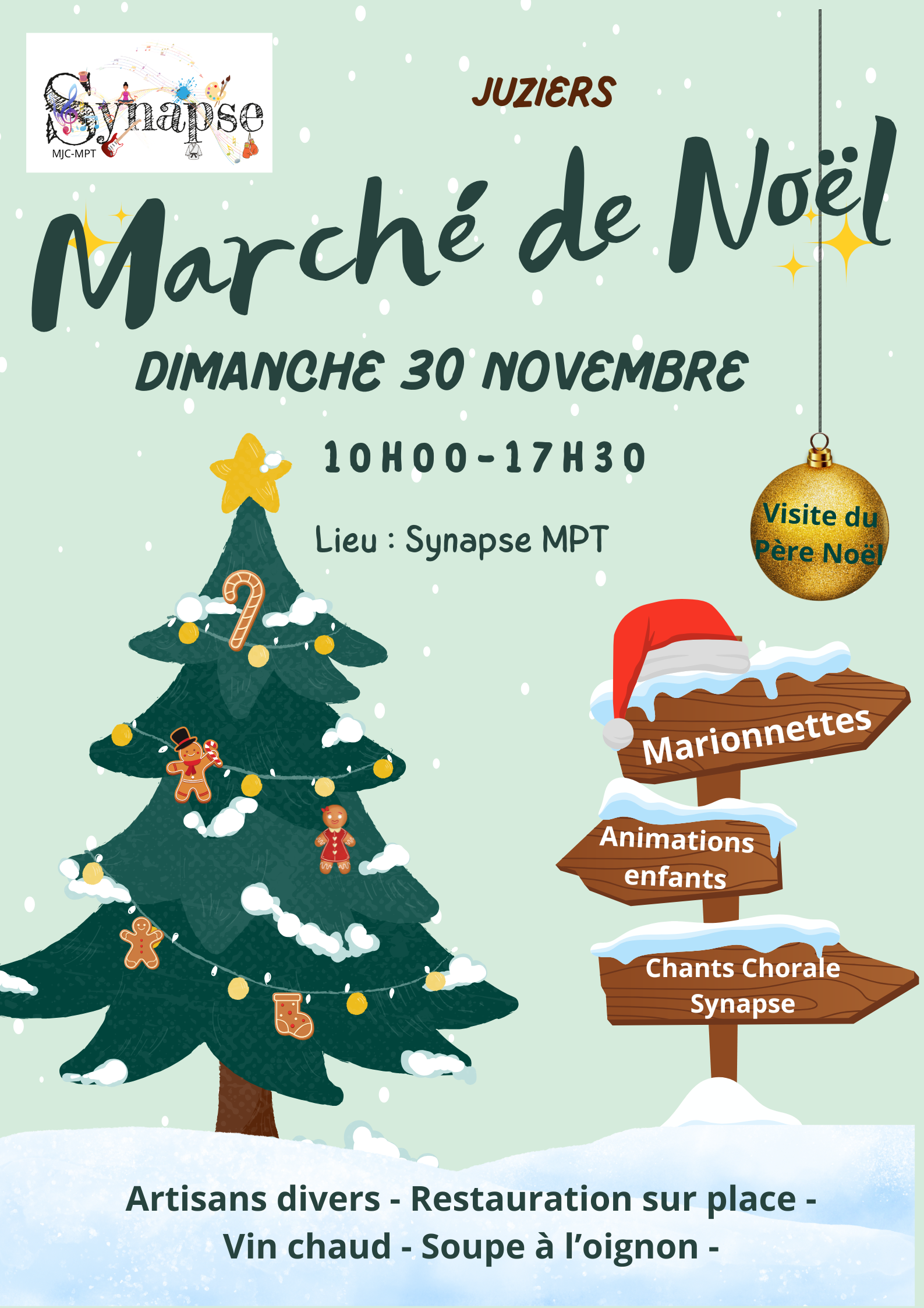 Accueil > Agenda > Marché de Noël Marché de Noël dimanche 30 novembre 10:00 - 17:30 Au programme Atelier création de bonhomme de pain d’épice et de pomme de pin Spectacle de Marionnettes à 11h et 15h Atelier Chorale de Synapse 14h Visite du Père Noël 15h30 -17h30 Visuel Affiche Infos & réservations Maison Pour Tous Avenue de Paris 78820 JUZIERS