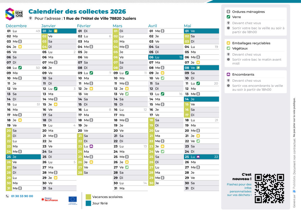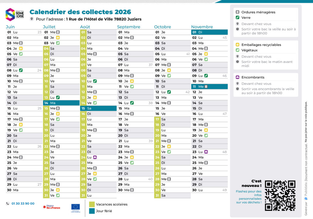 - Ordures ménagères : ramassage une fois par semaine en porte-à-porte pour les habitations individuelles. Ces déchets regroupent les résidus quotidiens (hors végétaux et produits dangereux).